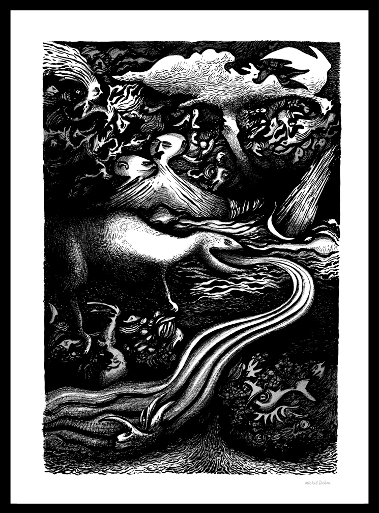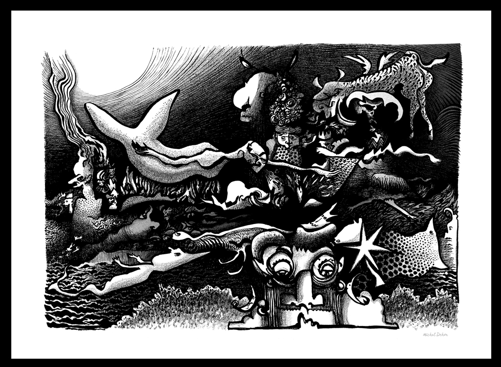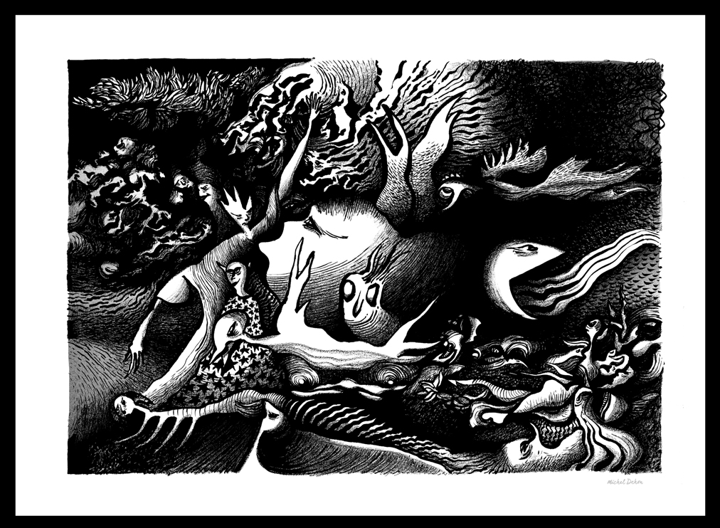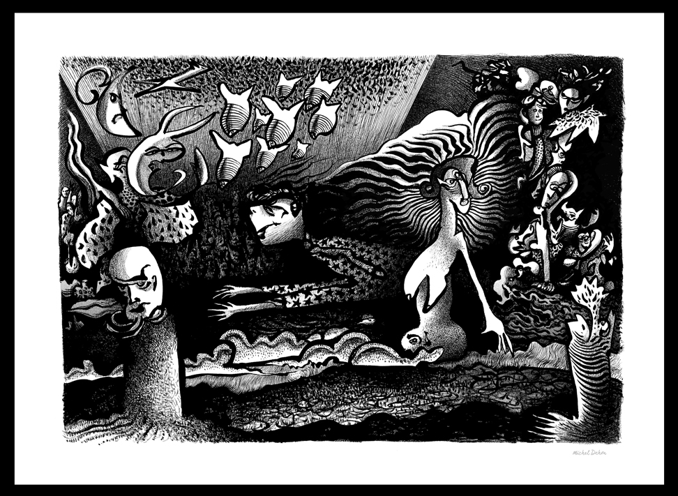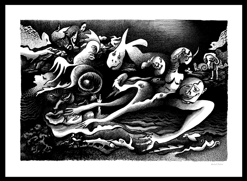 De un gesto espontáneo nace un mosaico de formas, personajes y paisajes nacidos de las profundidades del alma. Un conjunto de dibujos en blanco y negro que posteriormente, si es necesario, son realzados por un toque de color.