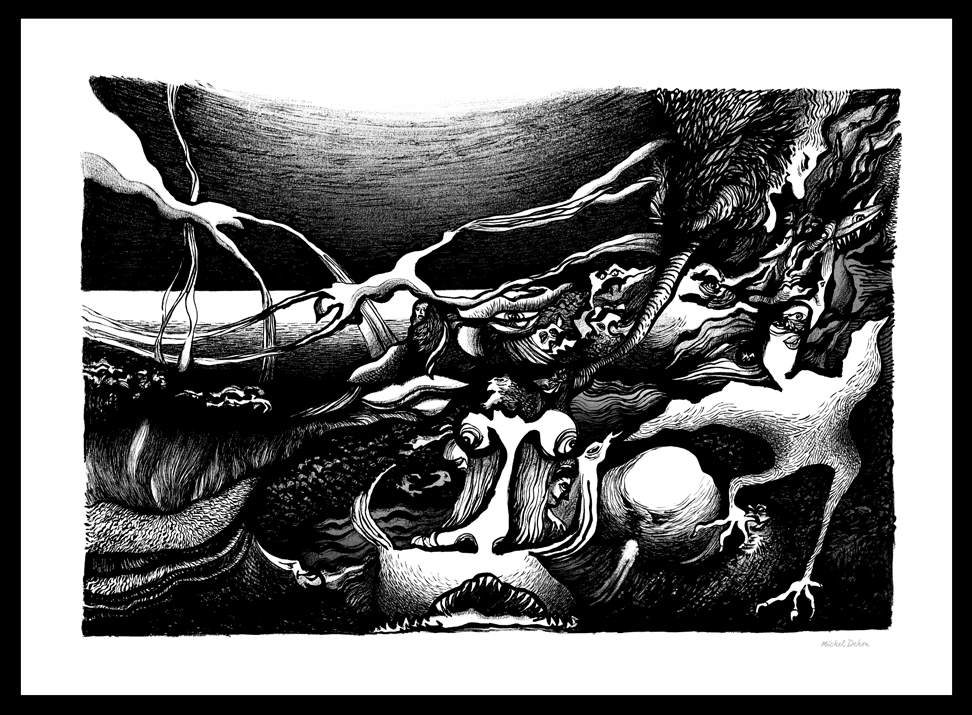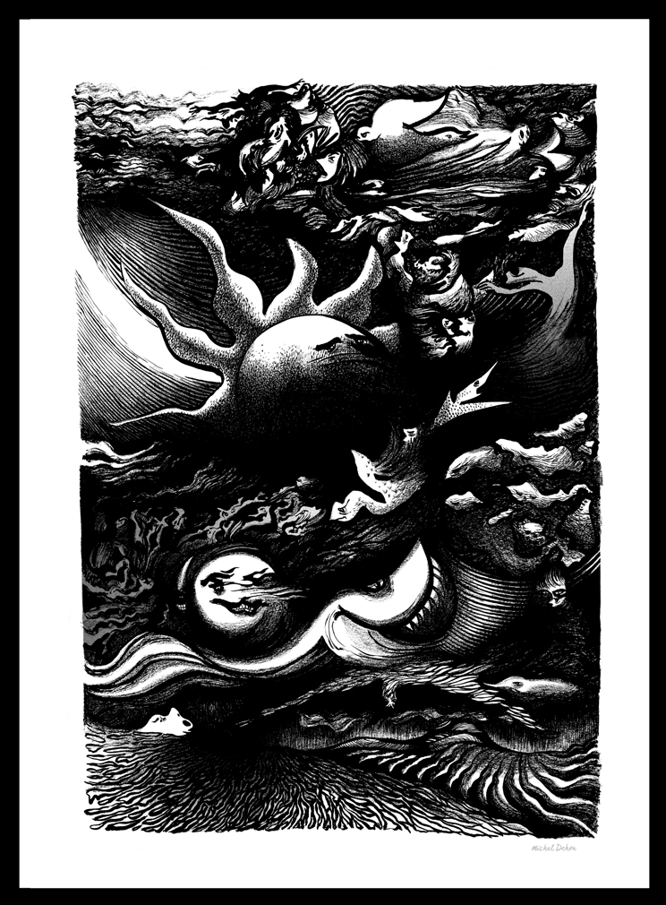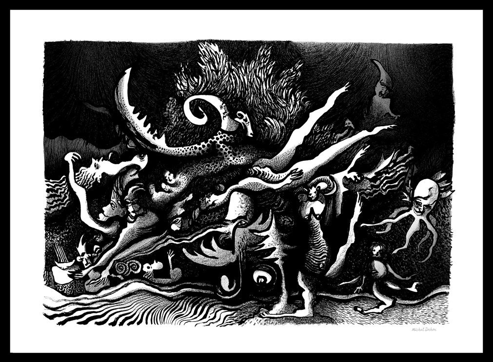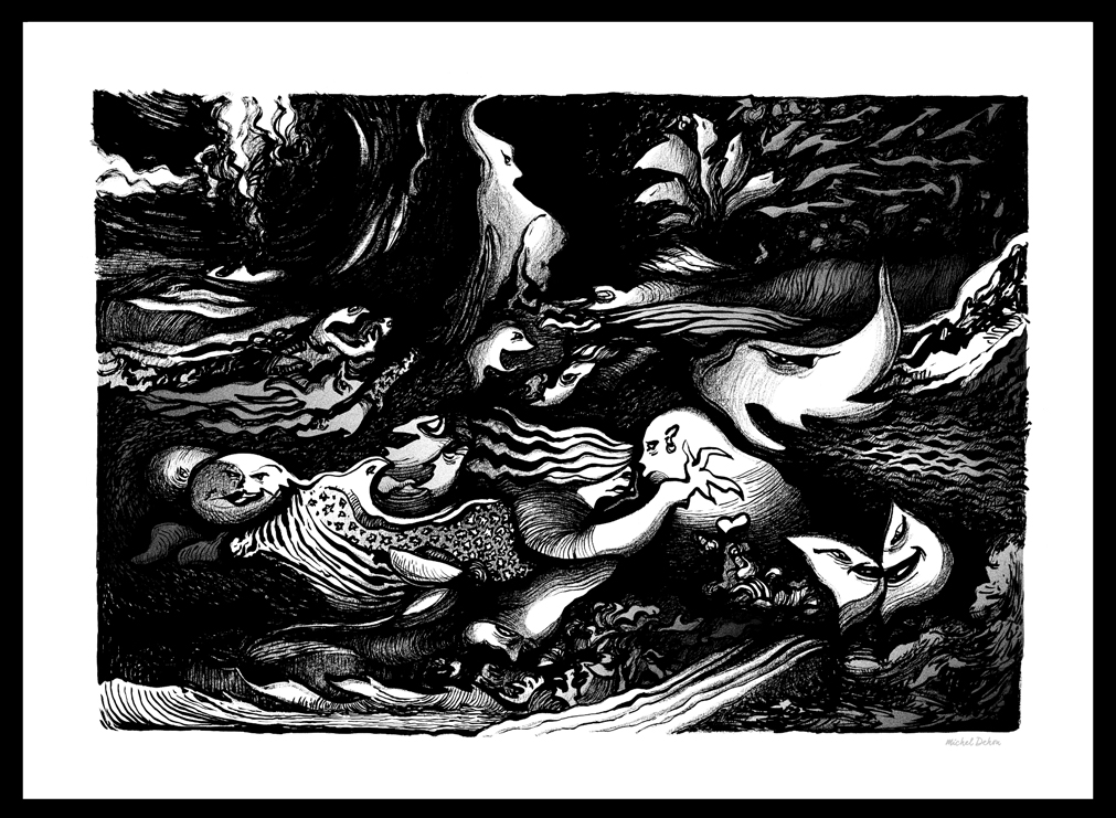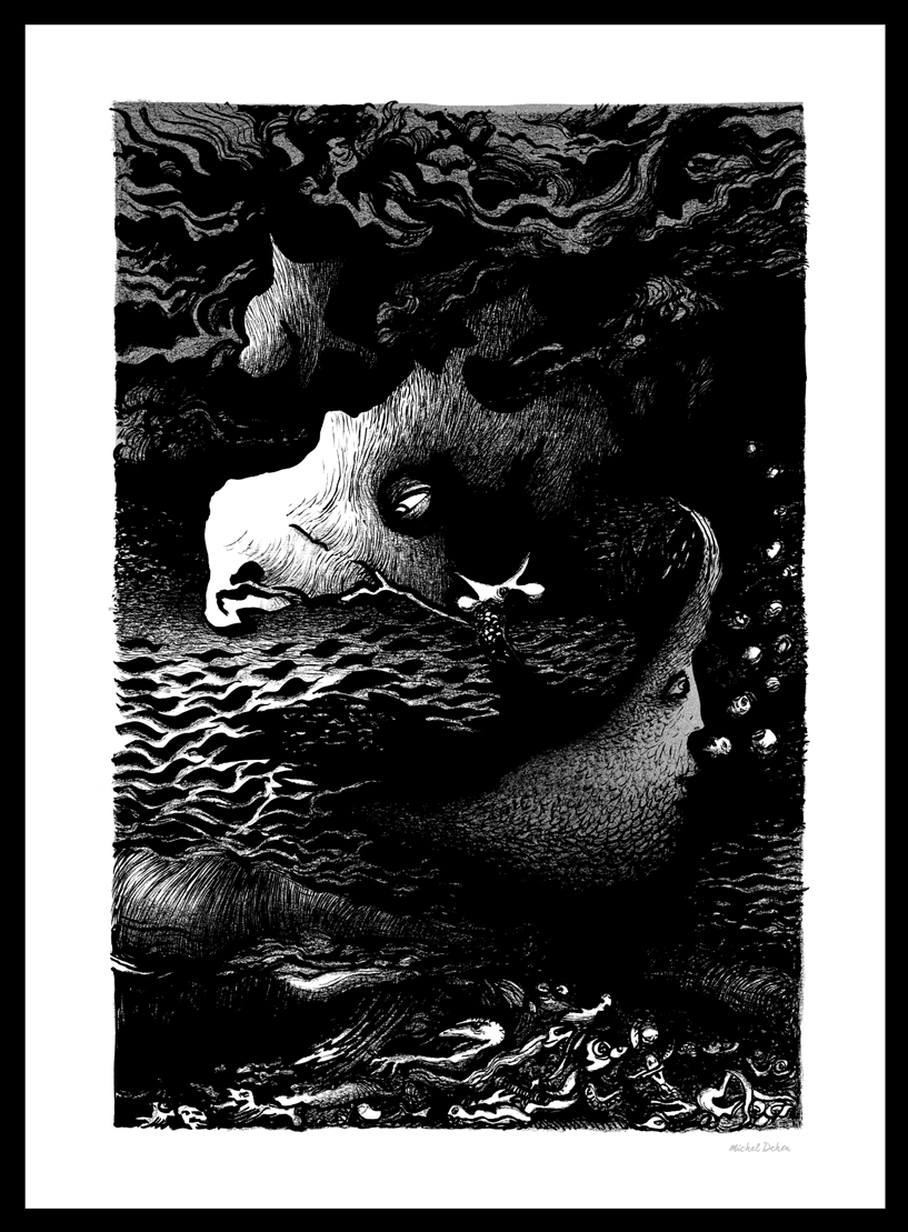 De un gesto espontáneo nace un mosaico de formas, personajes y paisajes nacidos de las profundidades del alma. Un conjunto de dibujos en blanco y negro que posteriormente, si es necesario, son realzados por un toque de color.