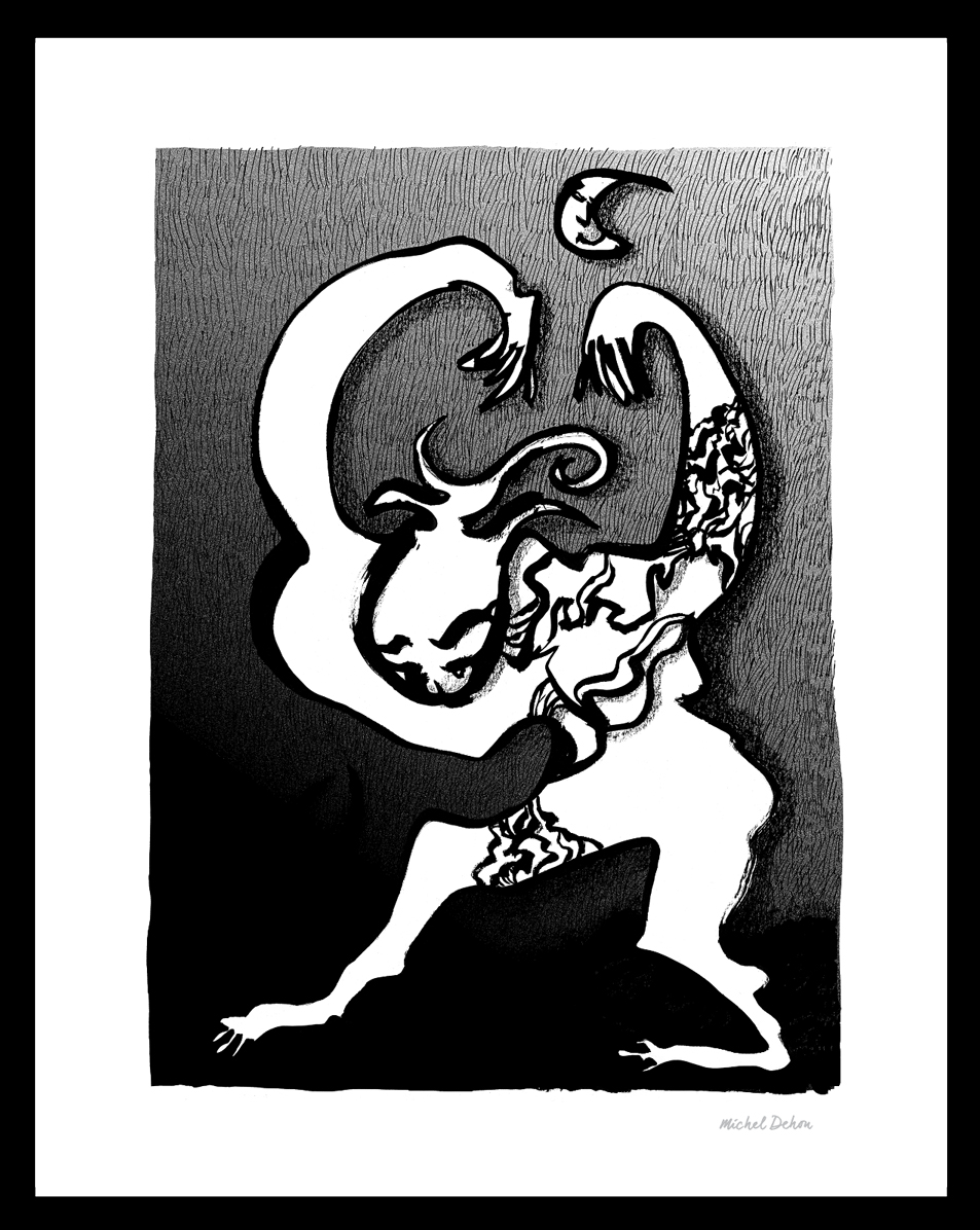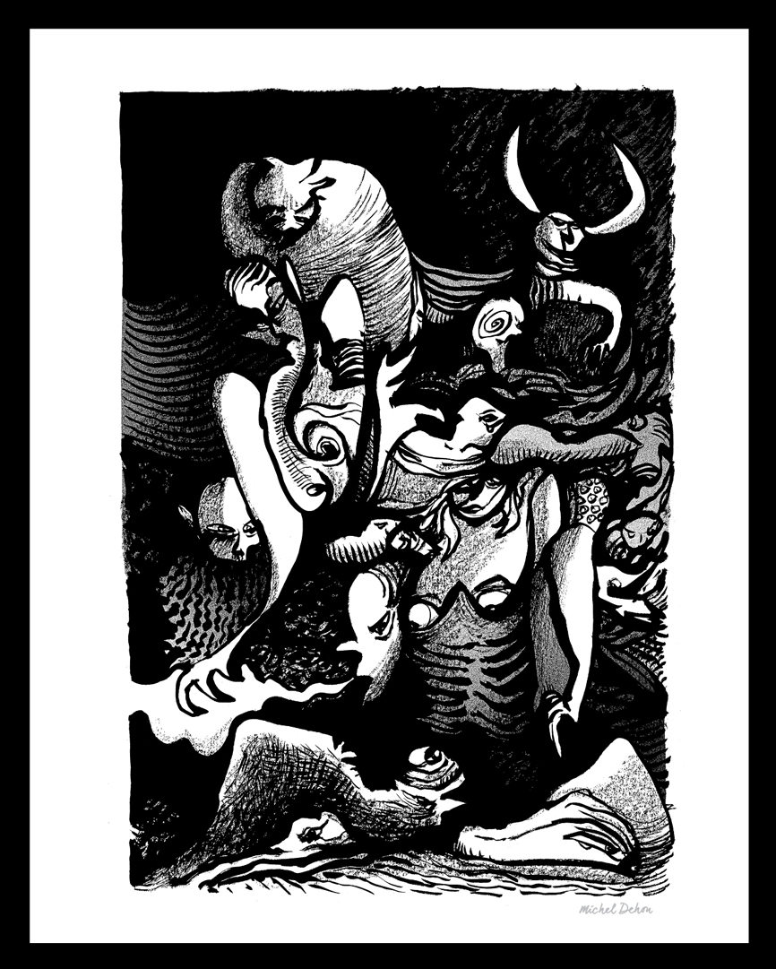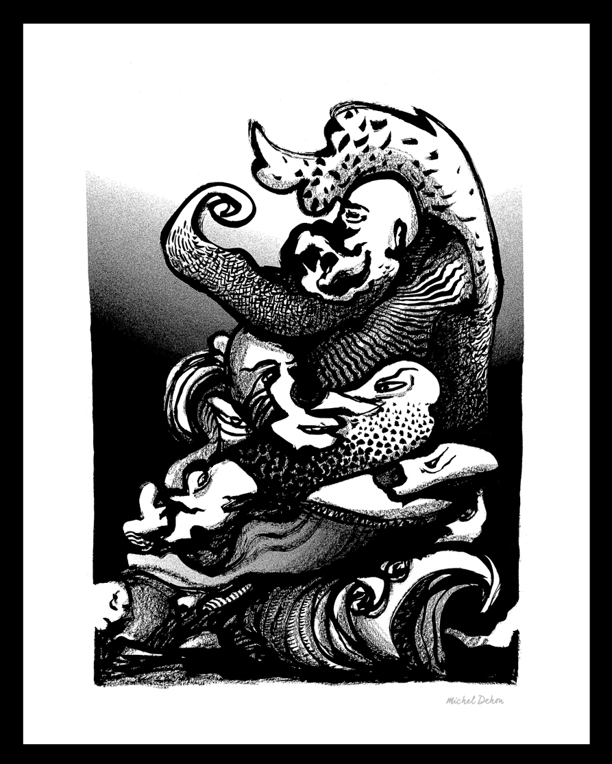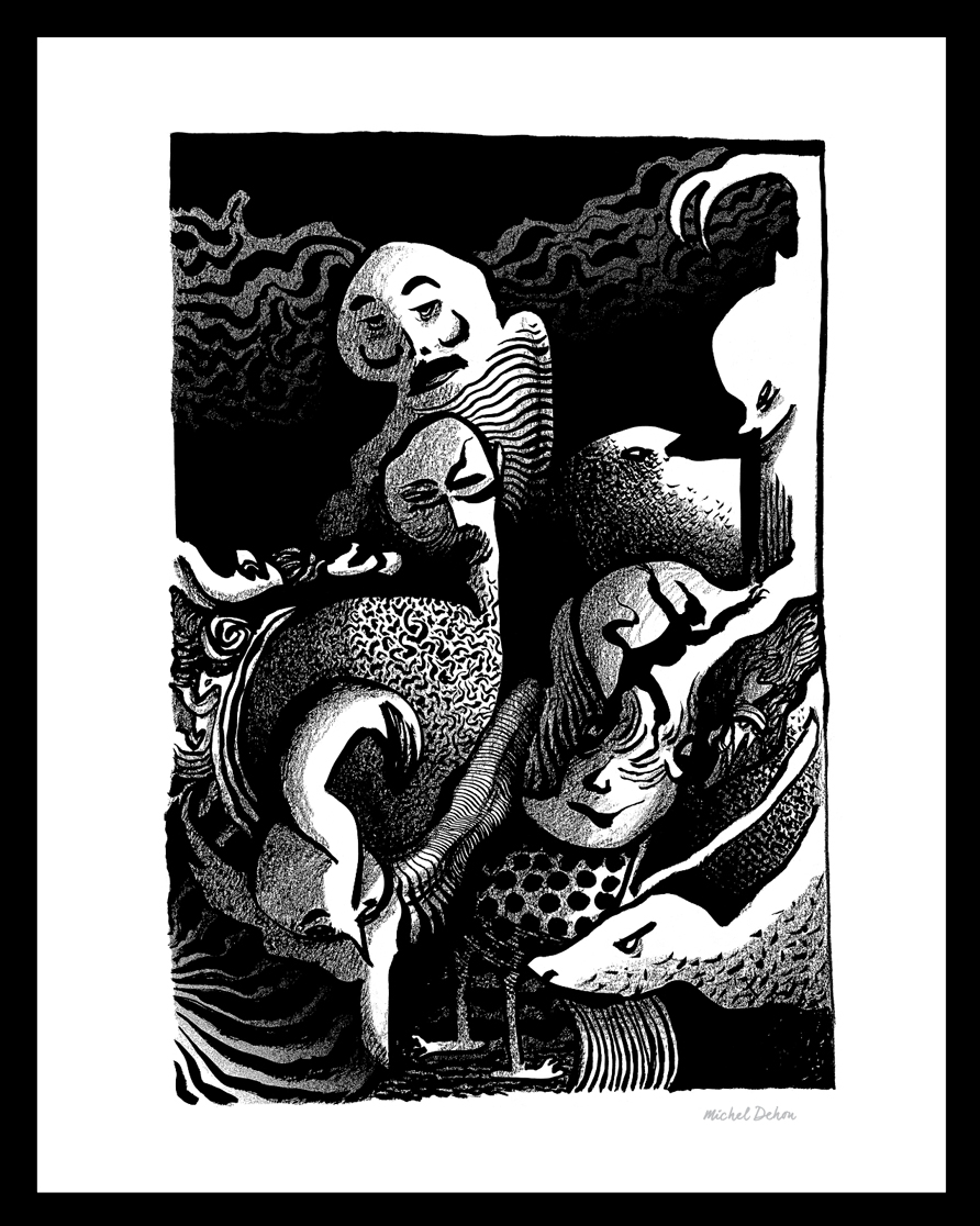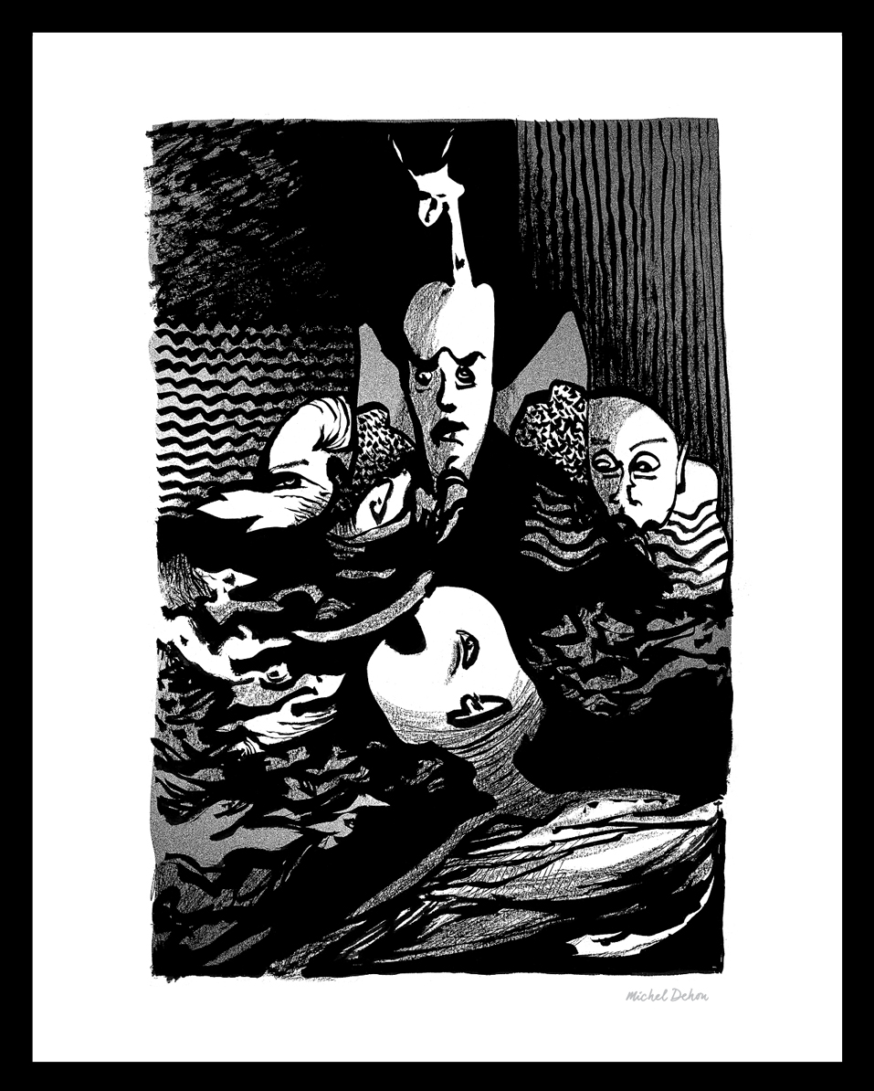 Qui se cache vraiment derrière un visage, une attitude, une personnalité? Là encore, le geste se libère, l’inconscient prend le dessus puis les personnages et les visages trouvent chacun leur place dans une composition équilibrée.