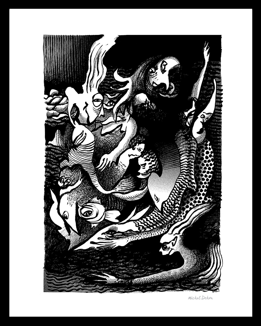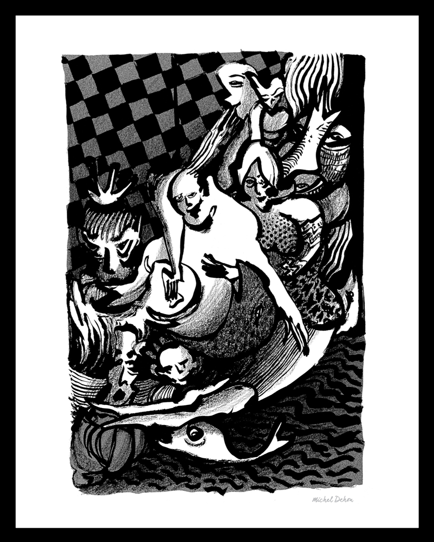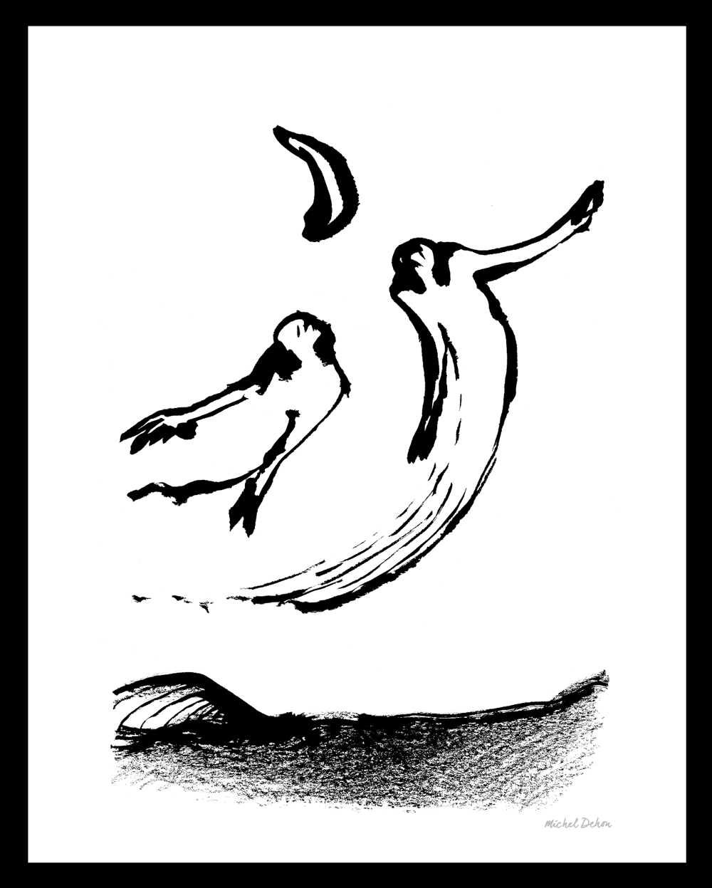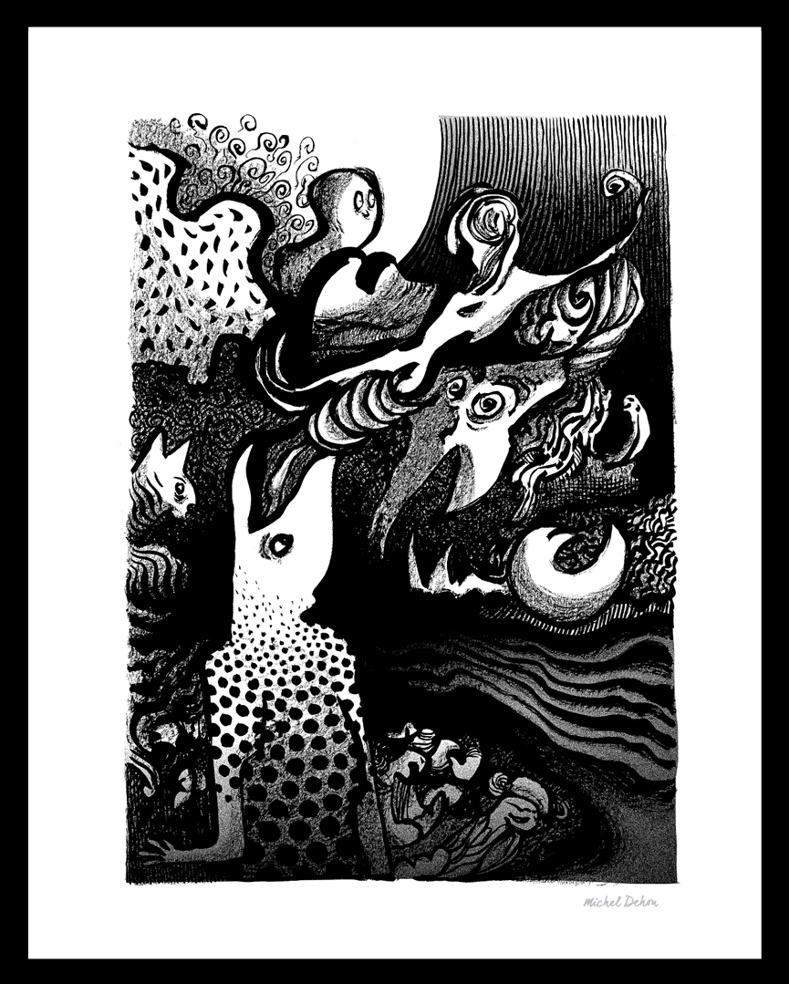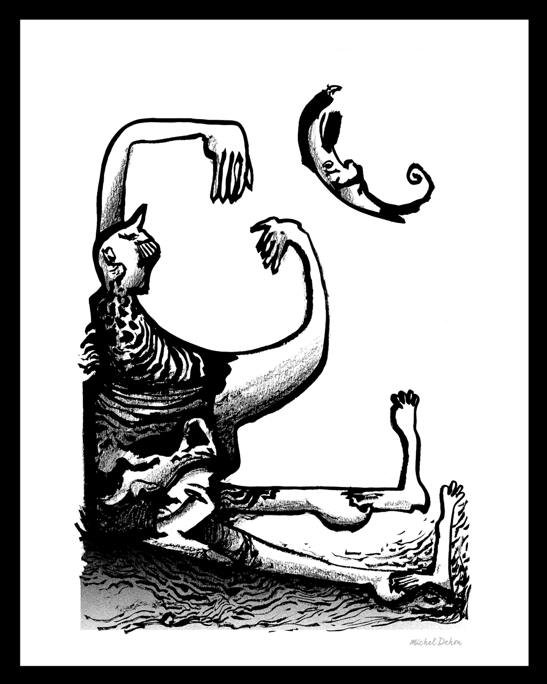Qui se cache vraiment derrière un visage, une attitude, une personnalité? Là encore, le geste se libère, l’inconscient prend le dessus puis les personnages et les visages trouvent chacun leur place dans une composition équilibrée.